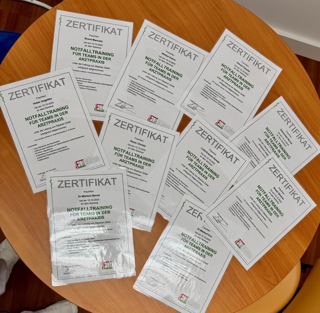 Um für unsere Patientinnen und Patienten die größtmögliche Sicherheit zu gewährleisten, hat das gesamte Team der Zahnarztpraxis Dr. Markert & Dr. Müller im Oktober 2025 an einem intensiven Notfalltraining teilgenommen.